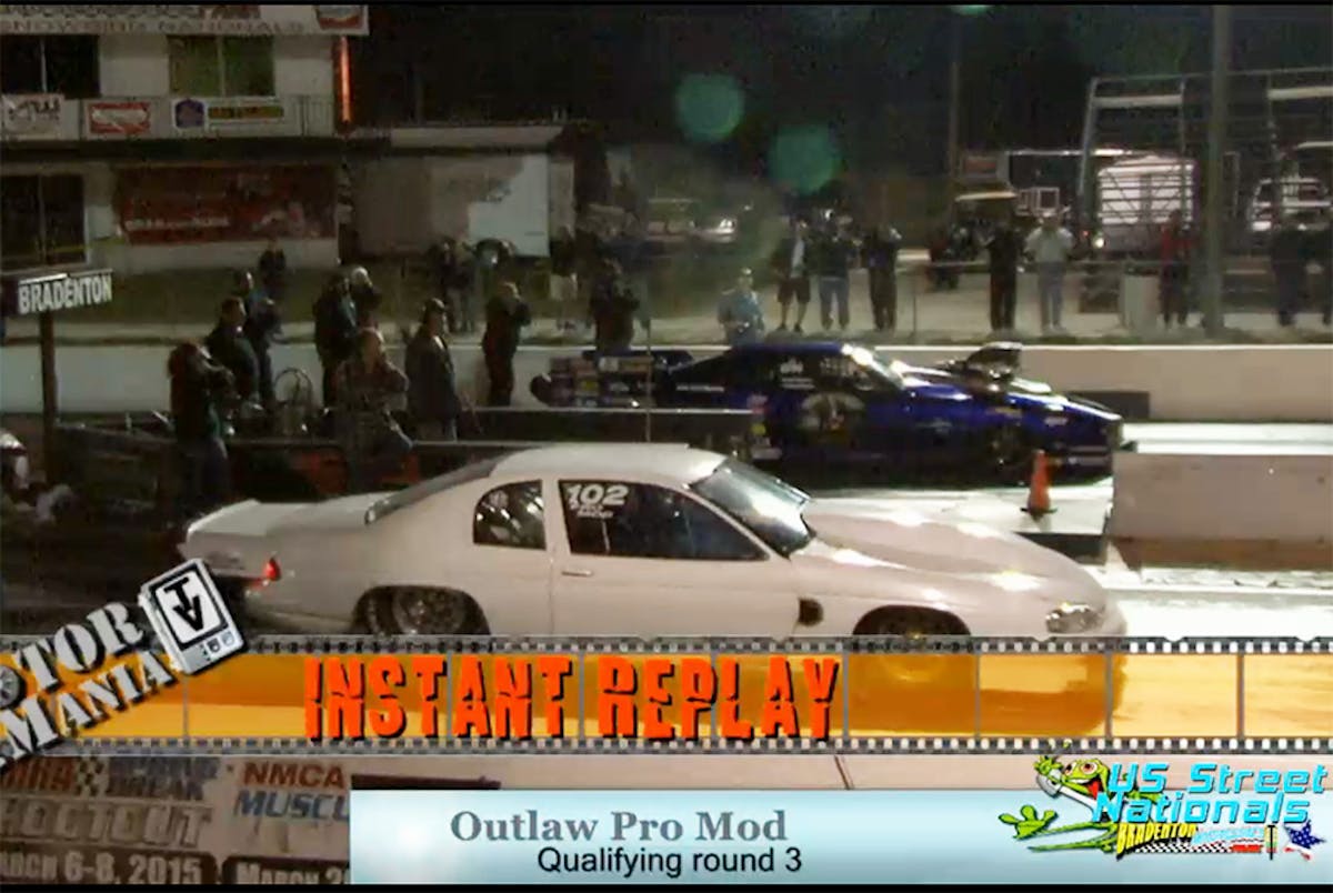 Futch, in his turbocharged Chevy Monte Carlo (the car that formerly belong to Mike Moran), was lined up in the right lane alongside past NHRA Pro Mod regular Commisso in his supercharged Camaro in the late evening session as both drivers tried to improve upon their position going into eliminations. At the drop of the green, Commisso motored out to 330-feet before making a hard move toward the centerline. At that point he wisely lifted and released the parachutes to help reign the car in.