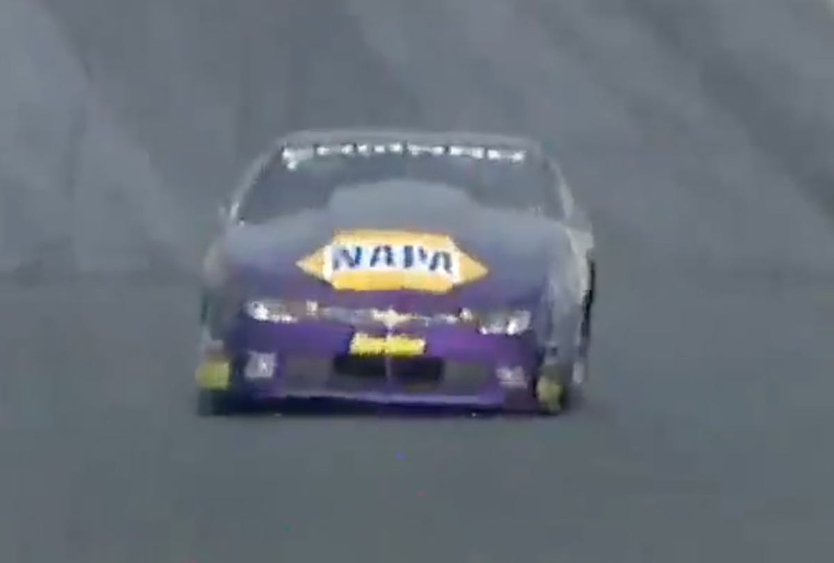 Luckily, Nobile regained his footing and managed to merely pancake the wall rather than strike it head-on or at a glancing angle, which would have done far more damage the race car. Alas, as one can see from the downtrack cameras, the side impact still did some hefty damage to the carbon fiber Camaro replica body, as the front fender on back to the quarter panel appear to have been flattened. That will leave chassis builder Rick Jones and his team with a lot of work ahead to get the car turned back around for the Carquest Auto Parts NHRA Nationals in Phoenix in two weeks.