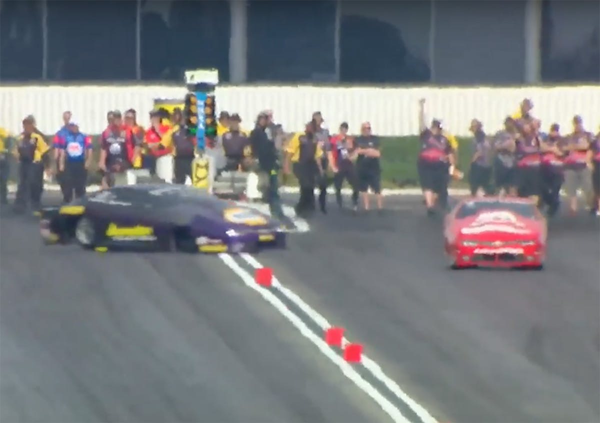 As was seen on Sunday’s broadcast on FOX Sports 1, Nobile, while racing alongside Drew Skillman in the second round of Pro Stock eliminations, made a hard left turn at around the 100 foot mark, sending him shooting across the race track. As the FS1 crew later illustrated after the incident, Nobile had driven into severe tire shake, causing him to momentarily lose control of the car as it drove across the centerline toward Skillman and the opposing guardrail.