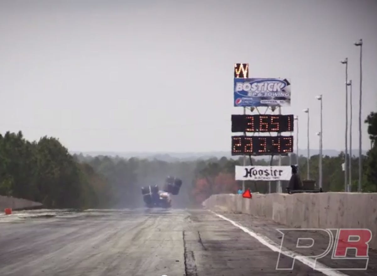 It’s no secret that, generally speaking, turbo combinations make a lot of steam at the far end of the track, though often at the expense of the bottom end grunt of a supercharged combination. Exhibiting that point in probably the most extreme fashion possible in the 1/8th mile, Eric Dillard, already the PDRA Pro Extreme MPH record holder at 221 MPH, blasted to a brain-melting 223 MPH speed in pre-race testing at Rockingham Dragway on Thursday.Screen Shot 2015-04-10 at 2.44.34 PM