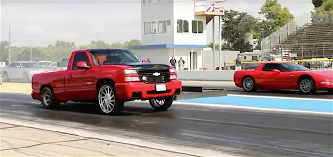 After making a quick wheel and tire change to a more suitable set of drag racing tires, a second pass reviles the potential of this supercharged LS3. As the Christmas tree drops, the Silverado manages to get the jump, which provides an interesting outcome. Cracking out an impressive 13.37 at 91 mph, it narrowly edges out the same red Corvette for the win. And in the process, it perfectly illustrates the differences, on back-to-back runs, of tires designed for