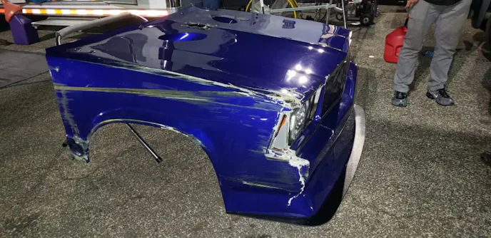Webb, a chassis builder by trade, said a quick look over the car has revealed primarily body damage to the passenger side when it clipped the guardrail upon touchdown — the nose, door, and quarter panel all skinned up and crinkled. Once he gets the car on the chassis table he’ll better diagnose any unintended modifications to the frame itself.