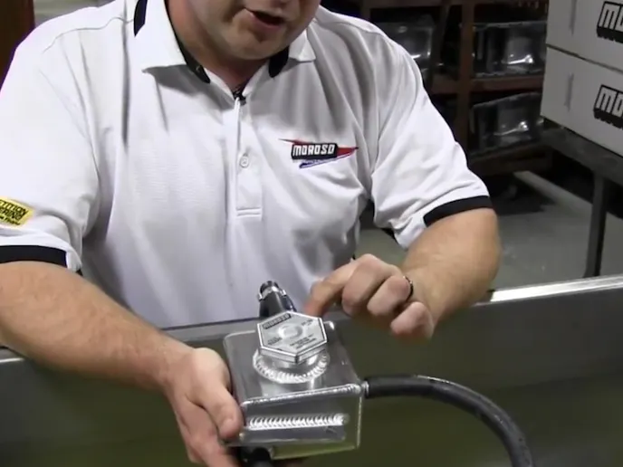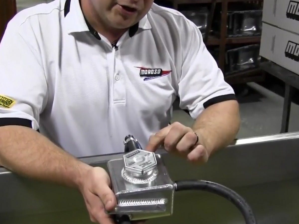In the video, Scott shows you how they pressure test the tanks at Moroso with the caps on. You can see the difference between when the cap hasn’t been correctly seated on the filler neck, and when it has been put on correctly. After the cap has been seated correctly it seals the tank and prevents any leaks when full pressure is applied.