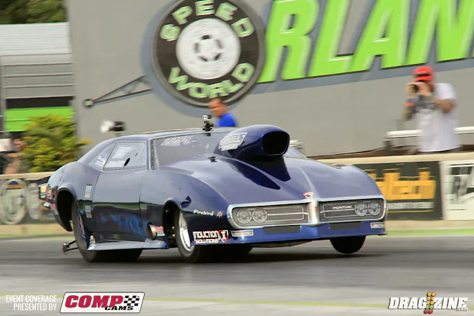 On the complete opposite end of the cubic-inch spectrum from Rojas’ is two-time NHRA Pro Modified world champion Rickie Smith, whose 903-inch Pat Musi powerplant could swallow up the little 2JZ in one gulp. Smith, already the owner of the quickest and fastest nitrous Pro Modified run in history, one-upped himself during qualifying at Orlando, scorching the Florida facility with a 5.760 at 250.18 mph. That run, which came by way of a .951 short time and a 3.799 to the 1/8-mile clock, qualified the North Carolinian atop the raceday field.