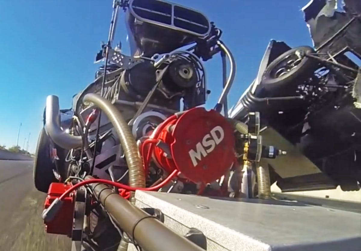 Morrison, at the controls of his supercharged CC/AA Altered, had just completed a quarter-mile pass and was going through his standard procedures to power the car down and bring it to a safe halt when, out of nowhere, came his competitor in the other lane, Paul Carey, in his AA/AGA Mazda RX7, crashing up and over his left rear wheel and catapulting up in the air.