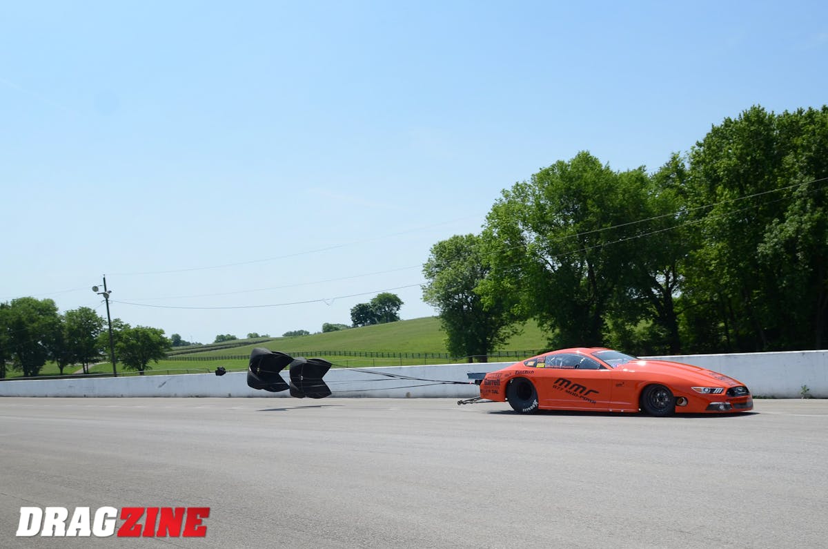 In their match, both Collier and Guest launched into tire shake early; Collier was able to pedal his car and drive through the shake, unaware that his dragster had broken the wheelie bar at the rear of the chassis designed to keep it on terra firma. Near mid-track, the dragster began its skyward climb, ultimately standing on its tail — the body peeling away as designed — as the chassis pirouetted and slammed back down on all four wheels, facing back toward the starting line. Collier’s dragster slid to a stop in the shutdown area —alert and conscious, the Safety Safari tended to Collier and removed him from the car for transport to the Topeka Trauma Center for evaluation.