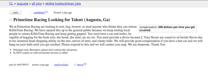 But perhaps the most entertaining part of Jackson’s (or a member of the Jackson camp, we’re guessing) after-race speech turned trash talk came in a satirical Craiglist ad posted on Sunday after the big matchup, entitled “Primetime Racing Looking for Talent” that left us with Coke splattered on our computer screens, that, among other comical statements, includes: “You must have a car and trailer, be capable of begging for the back tires, the break, the clear, etc etc etc. You must provide a driver because I, Tony Bynes am scared to sit beside Stevie due to his immense head chopping ability on the tree, nerves of steel, and clanky balls.”