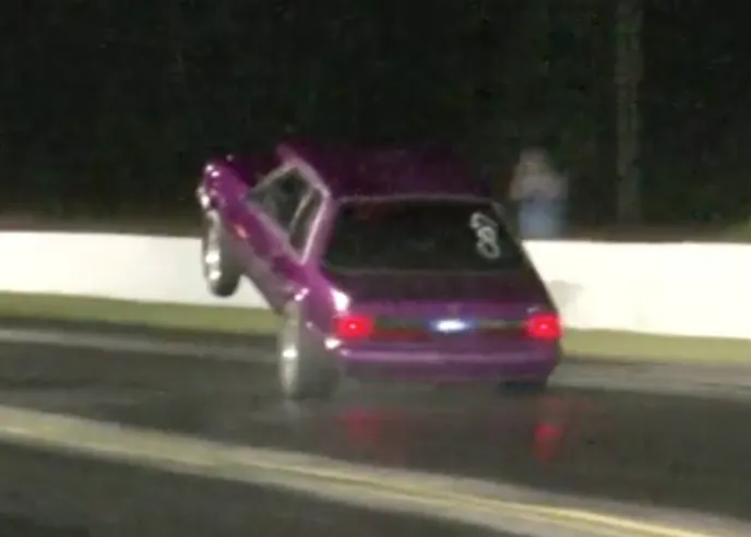 The ‘House of Hook’, Carolina Dragway, hosted Mike Hill’s Battle of the Big Dawgs over the weekend, where the driver of this Fox body Mustang got some serious hang-time and expertly worked the throttle pedal to keep the car both off the bumper and moving forward in pursuit of his opponent. While the race didn’t work out in his favor, it did result in one of the more impressive unplanned wheelstands we’ve seen in quite some time, as the front end stayed well in the air for nearly 500-feet, before crashing down on the centerline and swooping in behind his opponent.
