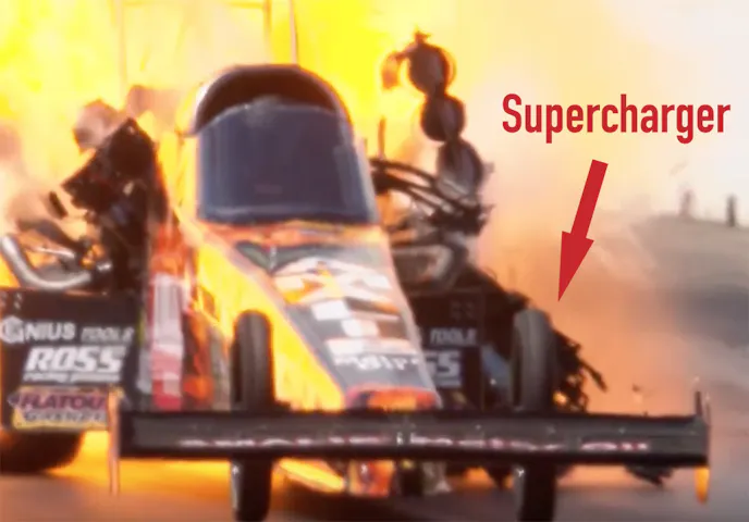 Whereas the majority of explosions in the nitro categories simply lift the supercharger off of the manifold and damage the rotating assembly and/or the valvetrain, McMillen’s unfortunate and expensive excursion was more akin to the detonation of a bomb — the supercharger being blown clean off the manifold, and the carbon fiber injector hat instantly shredded into oblivion.