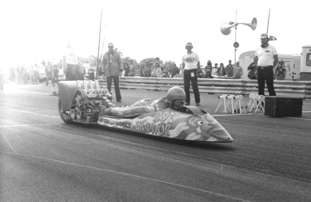 In our minds, the Jade Warrior isn’t among the most extraordinary and downright dangerous drag racing creations of all-time, but rather, it’s a contender for the title. One can only imagine what MacPhail was thinking when he drew it up, or rather, what he might have been drinking. Looking back, a rear-engine Funny Car or a monocoque streamliner made perfectly logical sense as concepts, and rocket or hydrogen-powered cars also seemed pretty legitimate on some sort of death-wish type of level, but laying down on a motorcycle, face down and pointing forward? That’s a different pay grade of nuts.