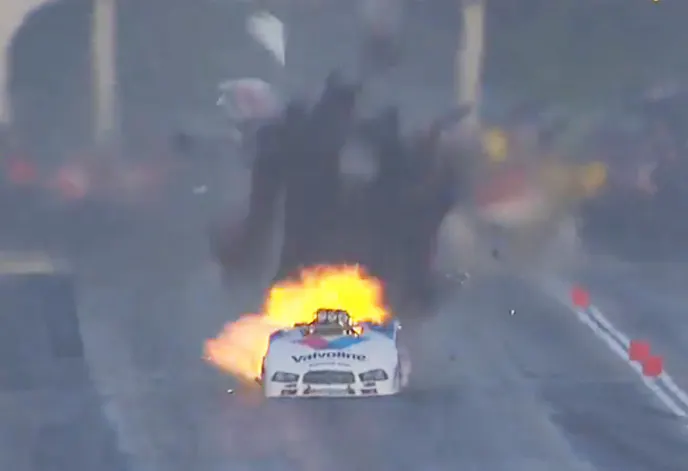 In the final session just a couple of hours later — and with Wilkerson and his repaired Levi, Ray, and Shoup flopper in the other lane — Jack Beckman rode out another violent explosion that shredded the body on his Valvoline-backed Dodge Charger, sending everything from the dash back sailing high into the air as Wilkerson, who slowed early, looked on in a moment of deja vu.