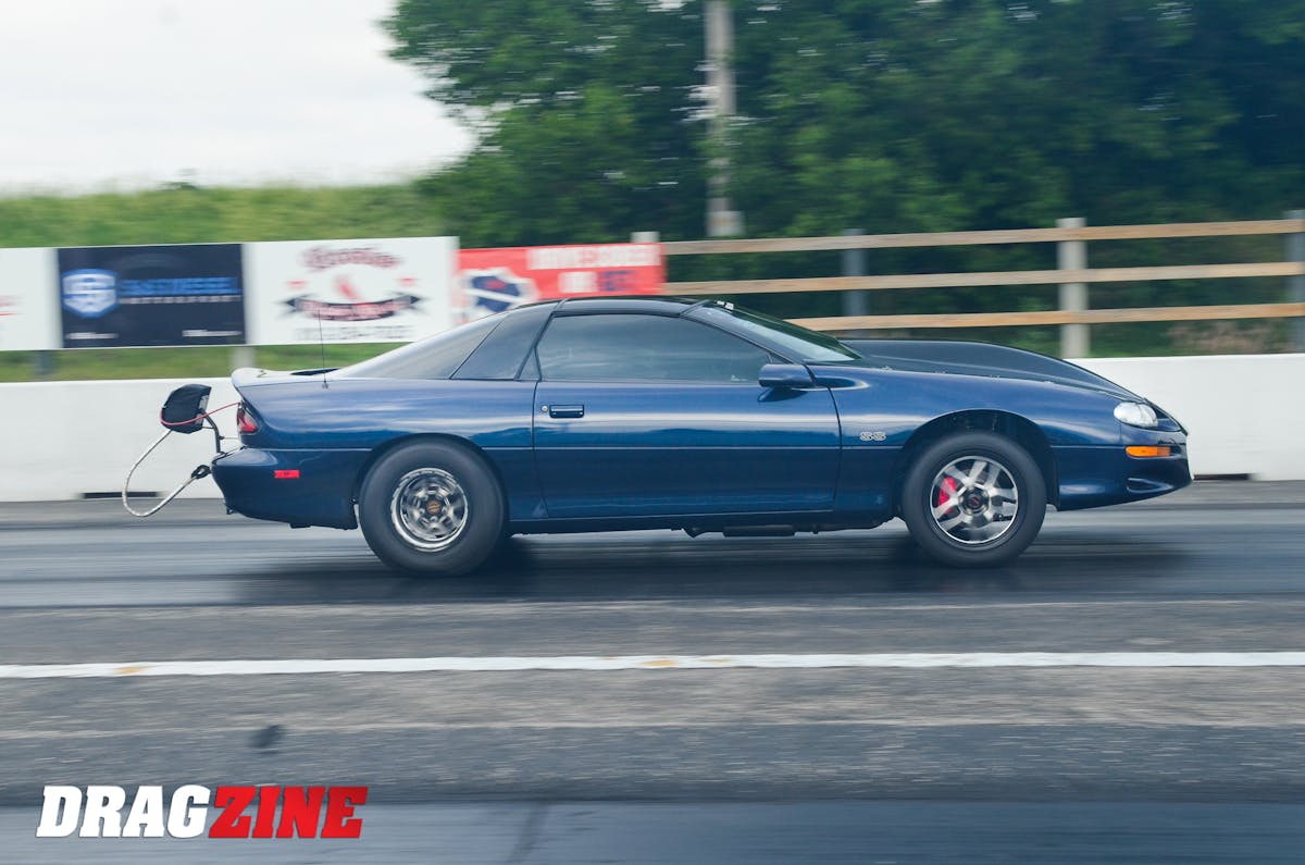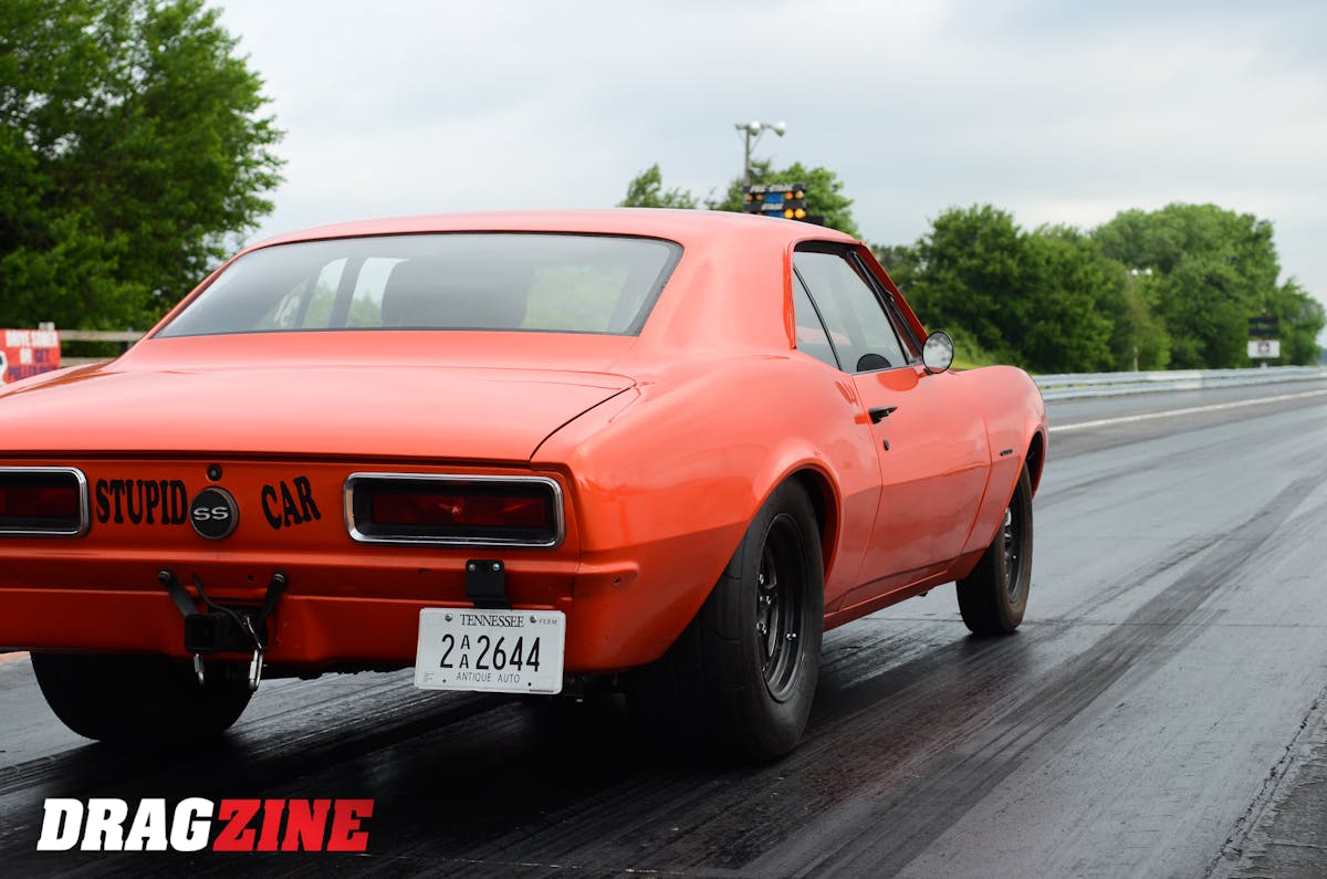 Tutterow, better on both ends of the racetrack—even despite the slowing 223 mph trap speed as he pulled the parachutes to regain control—was well out on Whiteley. Tutterow’s machine drifted left of the groove into the marbles and shot across the racetrack, making major contact with Whiteley’s J&A Service Camaro. As you’d expect with carbon fiber composite bodies, the initial impact tore the bodies free from the cars like wet toilet paper, even buckling the roof away from the chassis on Tutterow’s car.Â