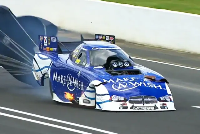 Just two weeks ago at the NHRA Southern Nationals in Atlanta, Johnson Jr. and the Make-A-Wish team did a number on not one, but two of their Dodge Charger bodies on back-to-back runs in eliminations, completely obliterating one of them and doing some considerable damage to the other. After a relatively trouble-free weekend in Topeka, the team tore another one up in the third session of qualifying at the NHRA Summernationals in Englishtown on Saturday when something in the engine let go with authority at the 1,000-foot stripe.