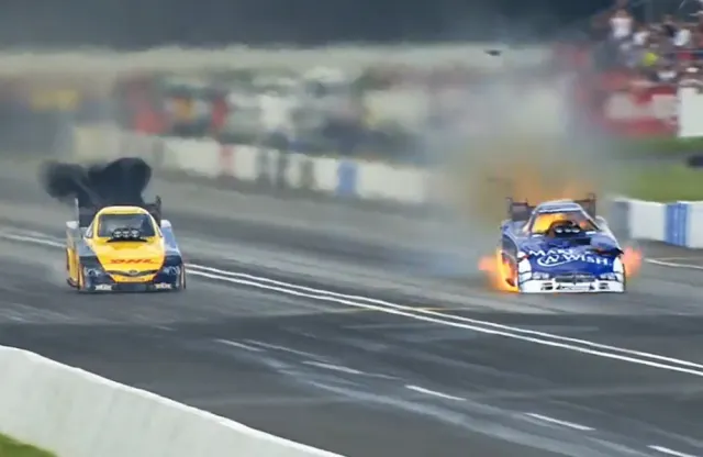 An engine explosion in the lights by a Funny Car that pops the burst panel and splinters the body at the fenders wouldn’t normally make for much of a newsworthy story, but when you consider the circumstances for driver Tommy Johnson Jr. and team owner Don Schumacher over the last three weeks, it certainly comes with a degree of intrigue.