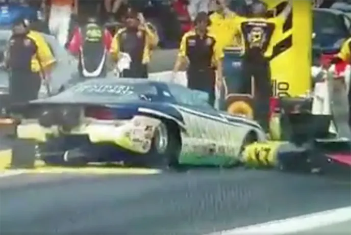 During the opening session of Top Sportsman qualifying, Cottage Grove, Minnesota racer Michael Freischel lost control of his 2001 Pontiac Firebird at the instant he released the transbrake, as the car took an immediate turn into the upright boards between the lanes and, ultimately, into the christmas tree.