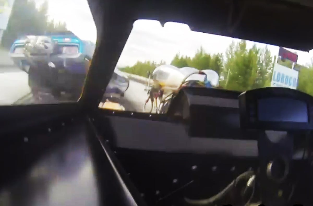 As the pair charged down track, Goudreau’s mount got loose over a bumpy section of the racing surface near half track, forcing him to lift off the throttle to keep the car in his own lane. Unfortunately, the momentum was already carrying him across the centerline and right into the path of Fersch, and despite his evasive maneuvers to avoid the oncoming Barracuda, the pair made contact at a very high rate of speed — Goudreau striking the right rear wheel of the ‘Cuda and sending Fersch up onto two wheels in wild fashion at close to 200 miles per hour.