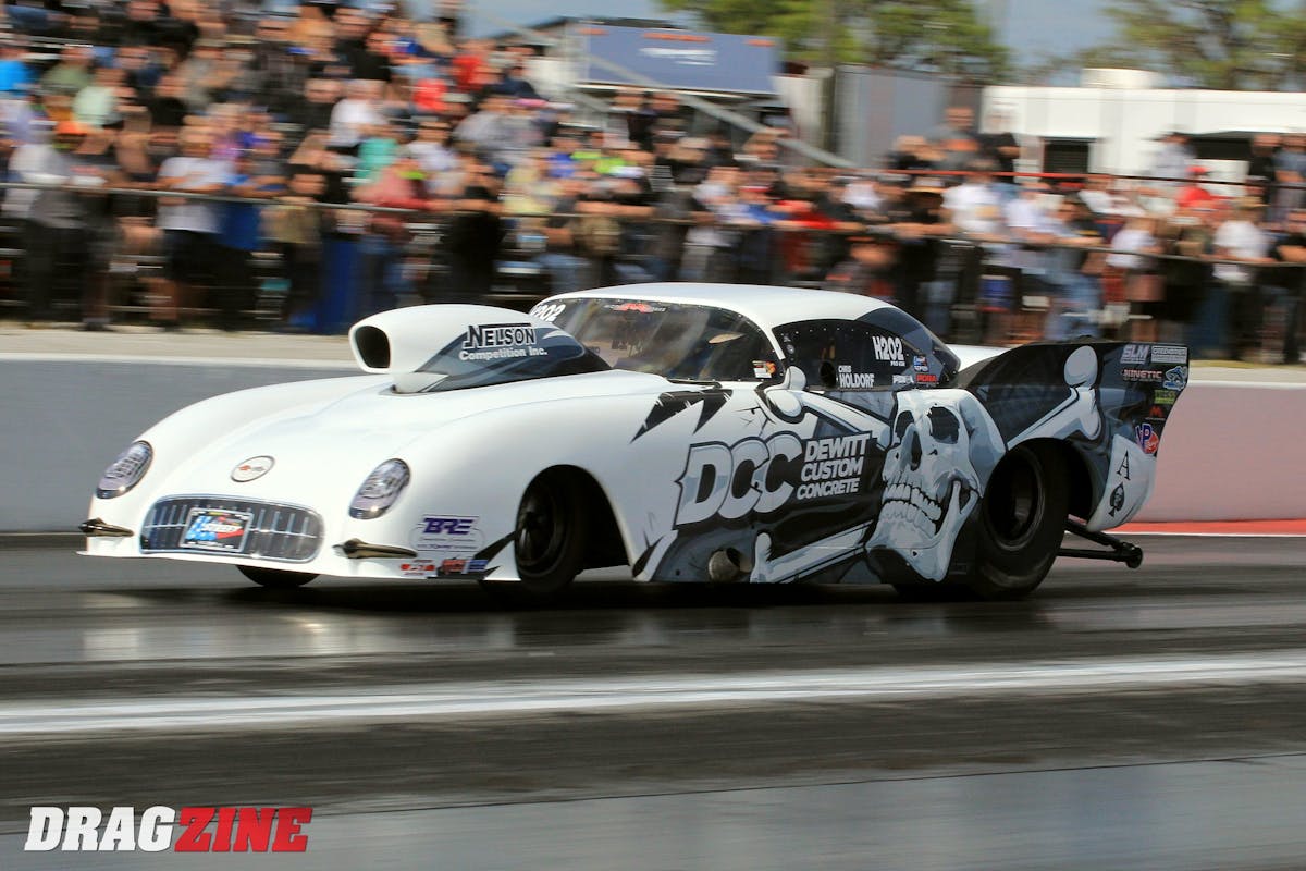 Georgia native Walter Lannigan, in his 1953 Corvette, was set to face Dillon Voss in his Florida-based 2017 Corvette in the first pair out, with a trip to the final round on the line. Lannigan, however, couldn’t get his car to fire and never made the turn to the water box. That handed what appeared to be a single into the money round to Voss. But after Voss completed his burnout, the Corvette lost fire and had to be pushed back behind the beams. Voss tried valiantly to re-fire and ultimately staged the car with the starter — a violation of the rule stating the car must be under power in order to take the tree and advance. That disqualified Voss.