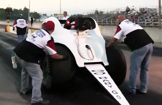 In this clip filmed recently at the Sikeston Dragstrip, a small eighth-mile facility in southeastern Missouri, the ’38 Fiat Fuel Altered known as the “Wild Rat” drives right around the water box and proceeds directly to the starting line. As most of the top nitro teams in the sport do today, a pair of crewmembers wipe down each slick thoroughly before staging, but aside from that, this thing goes completely “commando”.