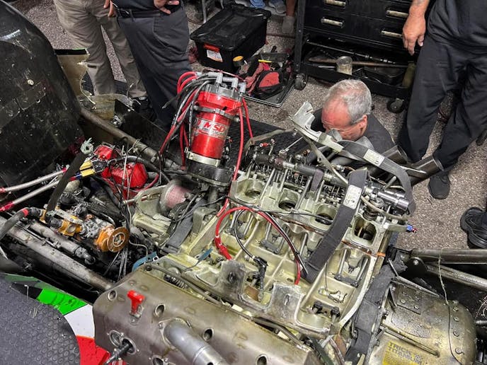 Bucher told Dragzine he and the Novelli camp are still unsure of the root cause for the explosion — one he called a “for real bomb” — but suggested it could have perhaps been a fuel pump failure. As Bucher approached the finish stripe, the dragster’s engine erupted into a fireball, sending shrapnel flying in all directions. So concussive was the force of the explosion that it destroyed the supercharger blanket and restraints and sent the injector, supercharger, and intake manifold sailing into the night. The cylinder heads were also catastrophically destroyed, and even the valley of the block appears to have been bowed from the forces.
