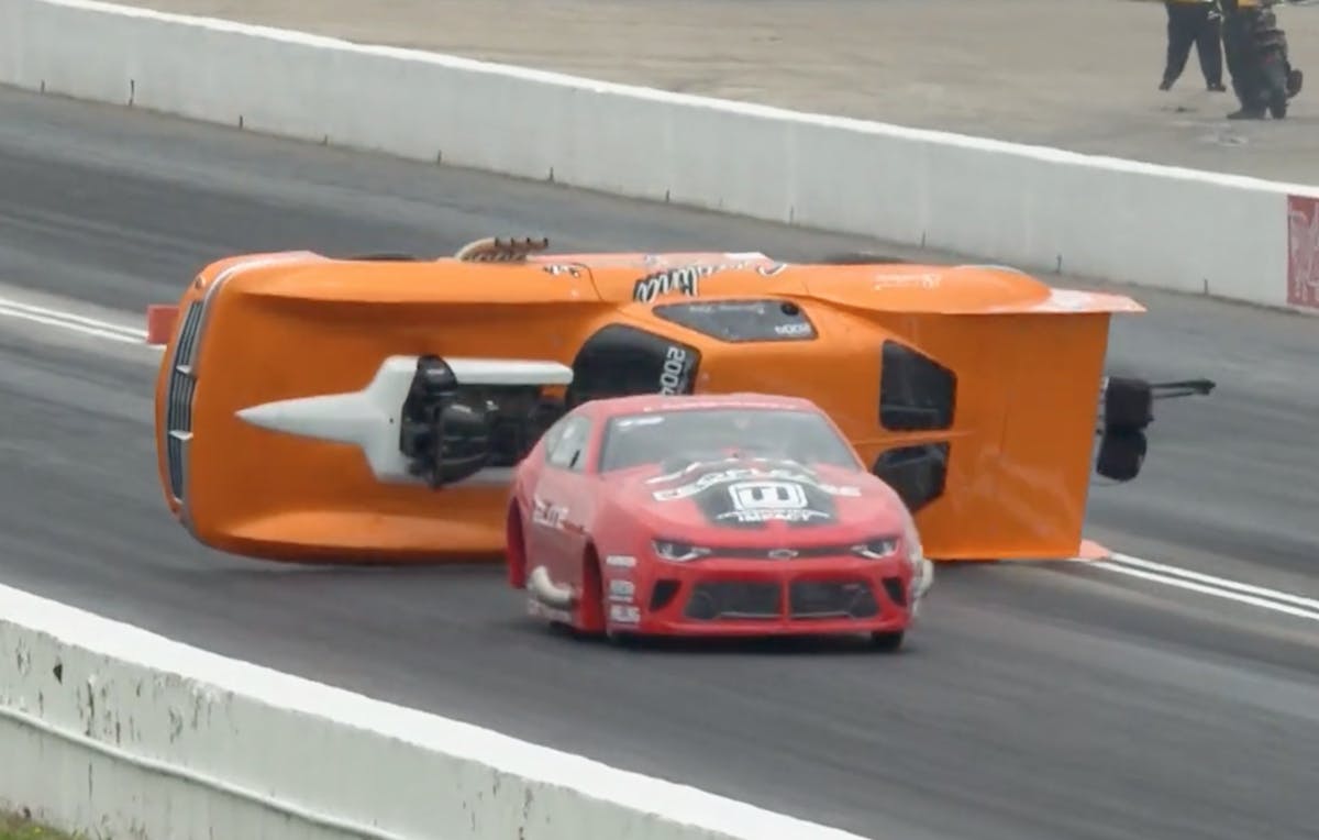 Ray, who qualified ninth with a 5.87, was racing Erica Enders in the first pair out in the opening round of eliminations when his bright orange Corvette drifted left out of the groove. Intent on getting the round win, Ray motored on through the middle of the track when his machine took an abrupt turn across the racetrack onto its passenger-side, passing just behind Enders’ Camaro and striking the guardrail roof-first. The damage, as can be inspected via the super-slow-motion footage from Fox Sports 1, was well beyond what could reasonably be repaired in one week’s time for next weekend’s Thunder Valley Nationals in Bristol — heartbreaking in itself for a racer sitting seventh in the standings.