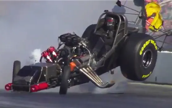 This latest massive backfire happened at the season finale at the Auto Club NHRA Finals, and owner/crew chief Jim Dunn summed it up as another unlucky parts failure. As the slow-motion video shows, everything was going fine for Lesenko until suddenly…BOOM! Flames wrap around the car, lifting the expensive Chevrolet Impala body up and over the frame, exposing Lesenko to the elements. A similar accident happened to Lesenko twice back in September at the Mac Tools U.S. Nationals.