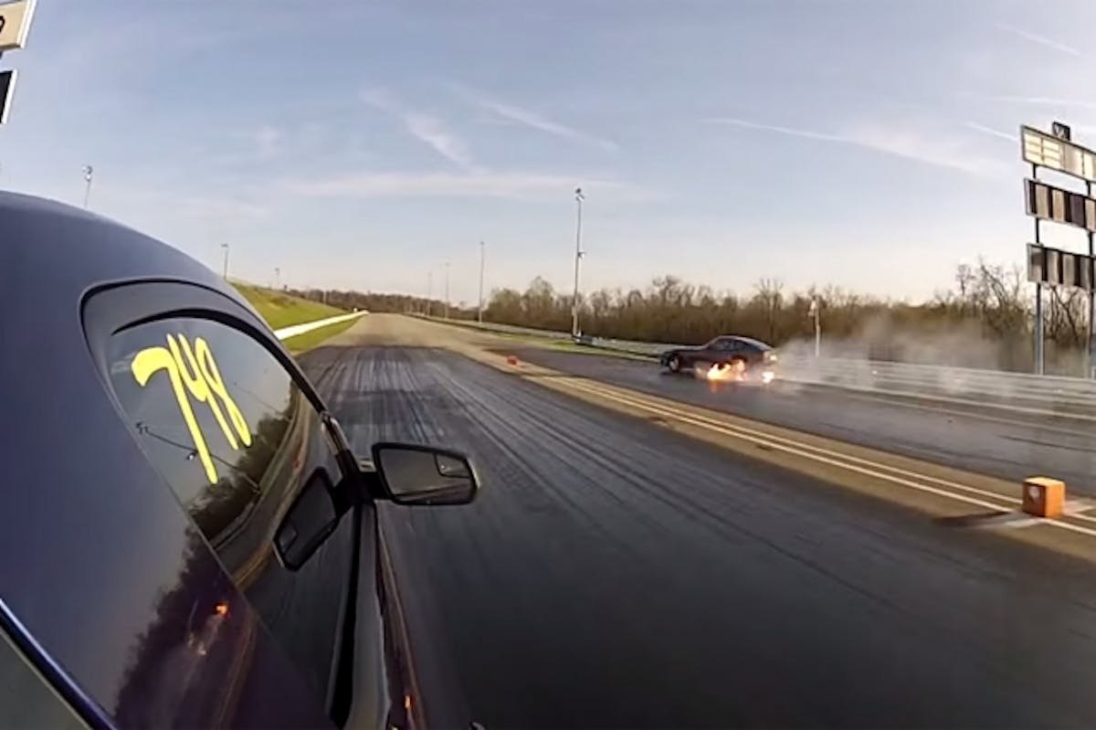 The Datsun does the deed sideways and on fire – and he also crossed the finish line with a 9.5x elapsed time, while the Mustang owner coasts through with a 10.94 pass. Crazy video, but an indication of just how quickly things can go from normal to not-so-normal, all during the course of a simple day at the dragstrip. Great driving by both racers!
