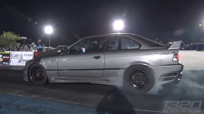 Kyle and the guys from 1320 Video heard this nasty-sounding German sedan before they saw it, and were not expecting that sweet sound to come from a European luxury car. The owner gives some details about the car, explaining it has a 355 cubic inch small block Chevy under the hood, and admits the camshaft is just a bit large to optimize this combination. Behind the small block is a TH400 transmission setup with a transbrake, but the stock BMW rear end is limiting the use of the brake and hurts the elapsed time a bit, since the owner can’t push the car too hard when the tree drops.