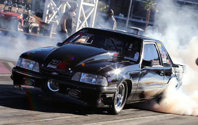 Behind the engine, a Neal Chance Racing Converters torque converter sends the power rearward to a beefy Mike’s Transmissions-built Powerglide to wrangle the torque and send it to the Mickey Thompson drag radials. To stiffen the chassis, a Wolfe 25.3 roll cage was installed by John Hammill of HamFab Inc. in nearby Edgewood New Mexico. Underneath, Jason Lee of PTP sent a full set of Lyons Performance upper and lower torque boxes to help with flex and eliminate a known weak link in the Fox body chassis. Groves wanted to thank local 8.5 racers Ricky Daniels and Craig Stringfellow for helping with the install. Josh Lindsey and the shock nerd himself, Mark Menscer, helped with the suspension and shock setup, and Ron Booth of M&F Auto helps Groves go racing.