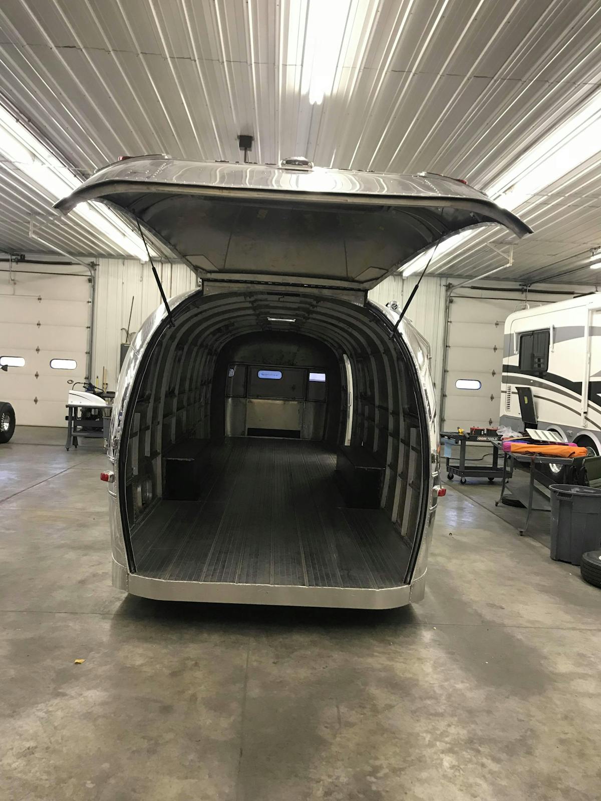 The interior was spray-foamed with 1.5-inch closed-cell insulation, primarily for strength; a new rolled aluminum interior was cut to fit and installed on the inside, and 12-volt LED lighting was installed inside and out. Long also carpeted the lower sections of the interior walls, where the original rolled interior remained. He also rebuilt the original windows (with 5-percent tint) and the awning. The rear door, which raise up instead of laying flat like a traditional trailer door, operates hydraulically. The exterior, all said and done, is 100-percent original Airstream.