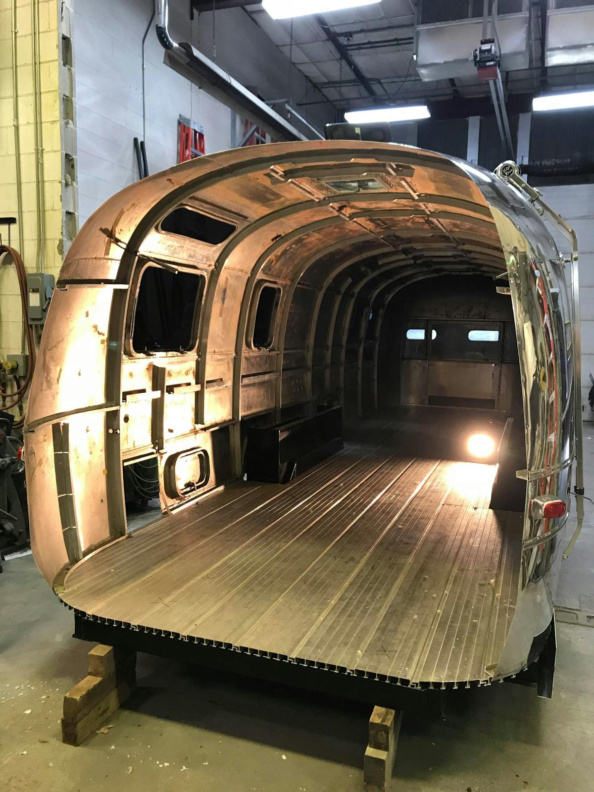 Long tabbed a local machining and fabrication company to construct an aluminum air-ride trailer — in effect a flat-bed trailer with mounting provisions for the factory skeleton of the Airstream — so it could be lowered to load the racecar. At the same time, he had a rear lift-up door cut from the original shell, and then put a ton of elbow grease — four steps of polishing — into the exterior skin, buffing and polishing it back to a mirror finish. Once the shell and trailer were ready, they were pop-pop-riveted together and then screwed together from the inside, “just like it was built before by Airstream.”