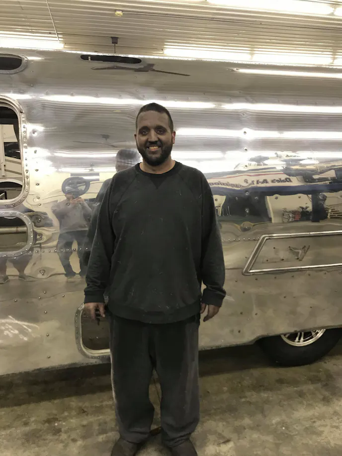 Long, a transmission mechanic by trade who navigates the country competing at big-money bracket races, bought the Airstream in his hometown of Mitchell, South Dakota 25 years ago. All that time spent sitting out in the elements had “sunburned and faded” the timeless polished aluminum exterior. “It was shot,” he says. “So I started stripping it and really had no idea what I was going to do with it initially, just knew I was going to do something to it. I was looking for a project to do, and I always liked Airstreams. I ended up selling my race trailer when I had just started taking this apart. I knew I was going to spending X amount of money into a new race trailer, so I thought why not stick that money into this Airstream and have something nobody else does?