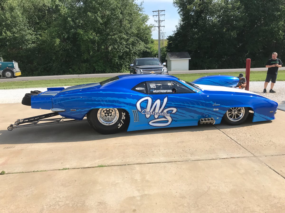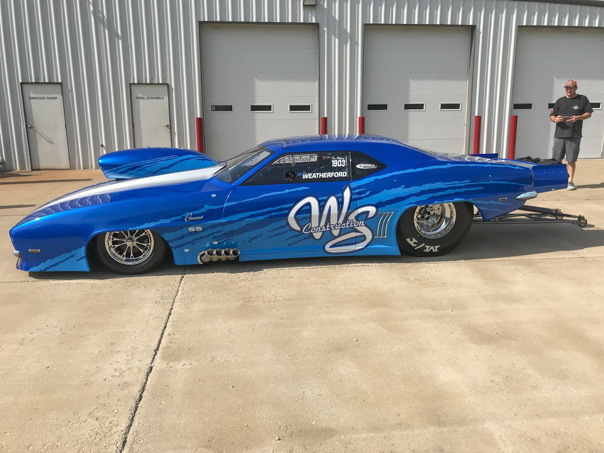 Weatherford, currently sixth in the Pro Nitrous standings, took delivery of his new machine last month, featuring silver SS stripes down its top and a striking scheme along its flanks. The new car replaces a similarly-appearing, Bickel-built machine that he’s been campaigning over the last couple of seasons in the quickest and fastest nitrous doorslammer category in the sport.