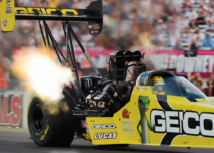 The recipe, despite its lack of diversity, is an effective one; 526 cubic inch Hemi engine, big top-mounted roots supercharger, direct drive transmission, mega fuel systems, huge wings and monster tires. Some estimates have power outputs of a single blown Top Fuel engine at upwards of 8,000 horsepower. Crew chiefs know the combination so well that they make minute adjustments to the clutches and fuel system and can dial that ridiculous power in almost as consistently as a bracket car.