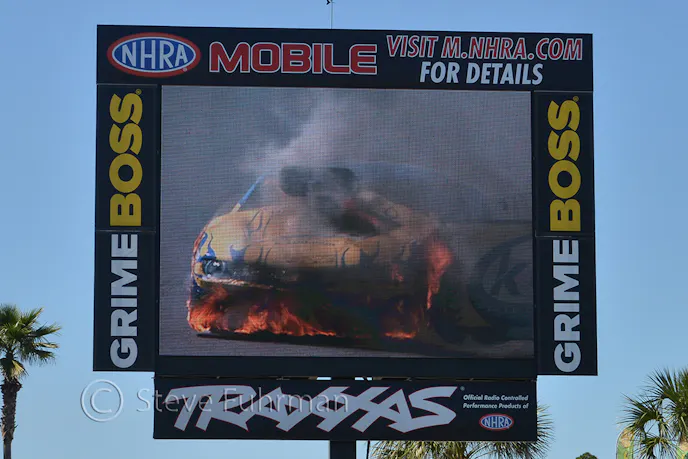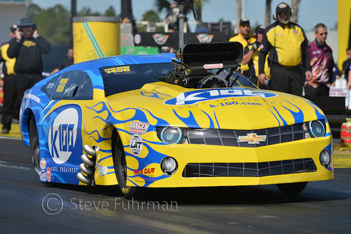 The Elma, New York native and his JanCen crew had just picked up their brand spankin’ new 2013 Camaro from the Race Car Specialties shop just two weeks prior to the NHRA Pro Mod opener in Gainesville, and like a kid with a flashy new toy, were plenty excited to get the new ride out of the box to play with it on the racetrack. After testing at the South Georgia Motorsports Park earlier in the week, Janis officially debuted the new car on Friday afternoon in the opening session of Pro Mod qualifying. In Saturday’s opening round of eliminations, Janis, the No. 16 qualifier, got a huge gift when pole winner Mike Castellana shook the tires and slowed. Janis legged the Camaro through to a winning 6.79 elapsed time, but the gift turned sour at the stripe when the engine erupted in flames. Like a Funny Car fire of old, the flames continued to build as Janis brought the car to a stop, and by then, the brand new nose on the K100 Fuel Treatment machine was a small inferno.