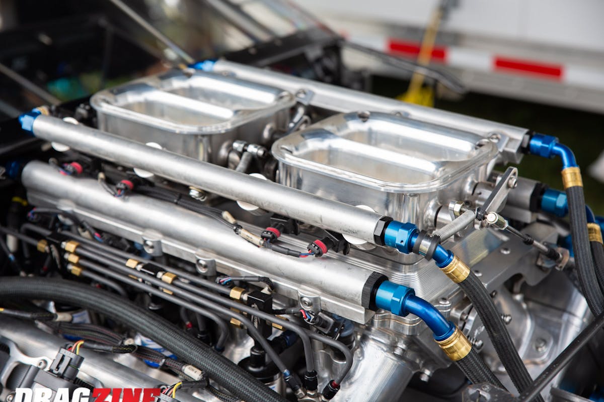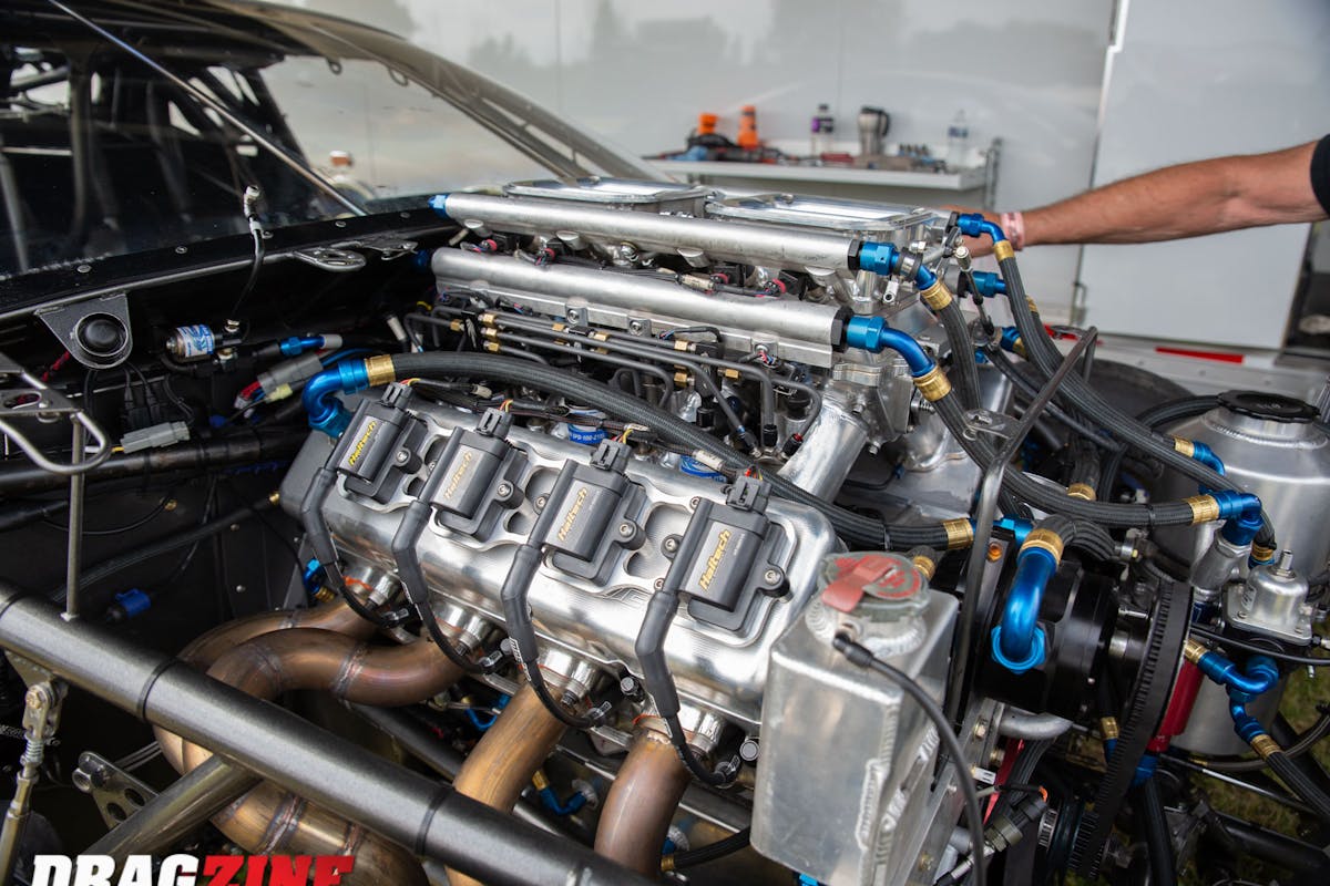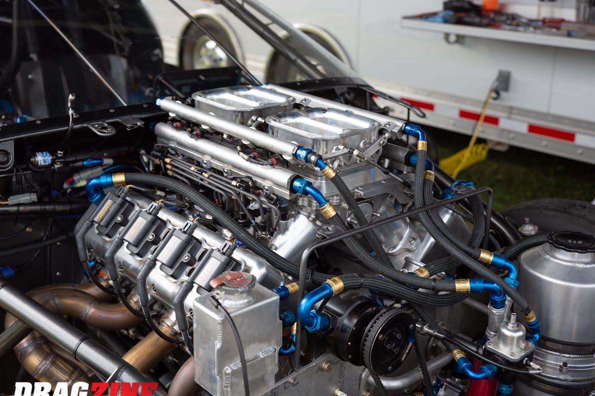 “Every other engine combination has better heads and intakes available, that’s why we had the billet parts made for the top end of the engine. Trying to make this thing live so far has been a challenge, so we had to move to a dry sump oil system to help the bearings survive. Since we’re running a 499 cubic-inch small-block we only have to weigh 2,400-pounds with a five-speed transmission. After we get the combo figured out it should run in the 4-teens no problem,” Allen explains.