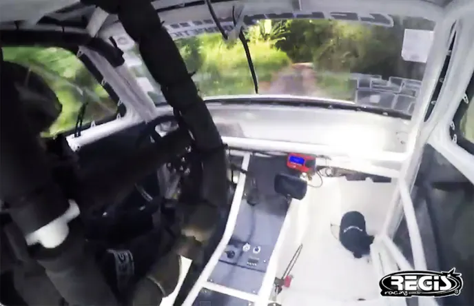Screen Shot 2015-06-30 at 4.55.01 PMBetween those two events, we see the boosted econobox-turned-drag car blast to a 5.23 through the eighth-mile, at 211 kph (approximately 130 mph), with the driver battling for control most of the way. As he hits the stripe and tosses the laundry, it becomes clear that something is amiss, but the driver immediately falls into “I got this!” mode as he begins to downshift the manual transmission back toward first. As he’s downshifting, the parachute and gravity assist the slowdown efforts through the uphill shutdown, then friction lends a hand as the car leaves the paved track surface and races up a hillside dirt path deep into the jungle. A dirt path that’s clearly there for  reason — it’s probably been needed and used before.