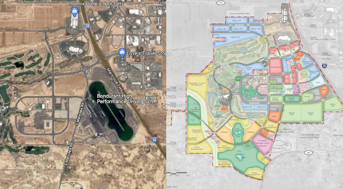The master plan, which a quick review of the drawing will illustrate, sits directly atop the existing Wild Horse Pass Motorsports Park 1/4-mile dragstrip, the neighboring Firebird Lake, the various road courses, and all associated property. The master plan, already approved by the Gila River Indian Community, is intended to include a large-scale sports and entertainment district, hotels, a wellness center, an event center, an outdoor amphitheater music entertainment venue, sports facilities, outdoor recreation and parks, restaurants, retail, and an office park. The development will also include a larger-capacity stadium for the Phoenix Rising Football Club.