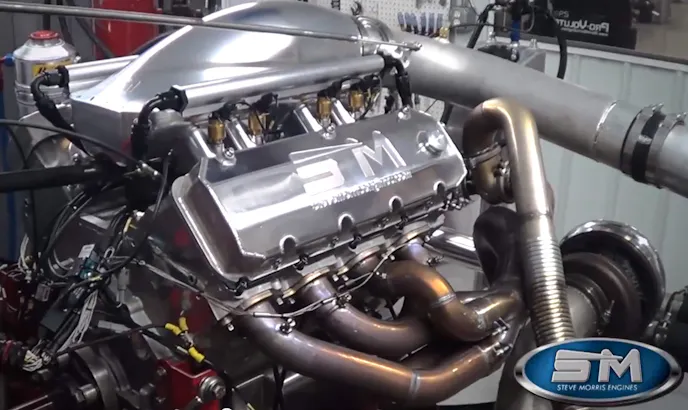 Engine building ninja Steve Morris recently revealed one of the latest and most impressive projects to go through his shop, in the form of a 615 cubic inch big block Chevrolet pumped full of boost by a pair of 88mm turbochargers, which is destined for a luxury, street-driven Bentley located in the United Kingdom. According to Morris, its owner has plans to compete at Drag Week with the car, sporting the engine combination that is very much like the Morris-built piece that powered Tom Bailey to victory in record time last year.