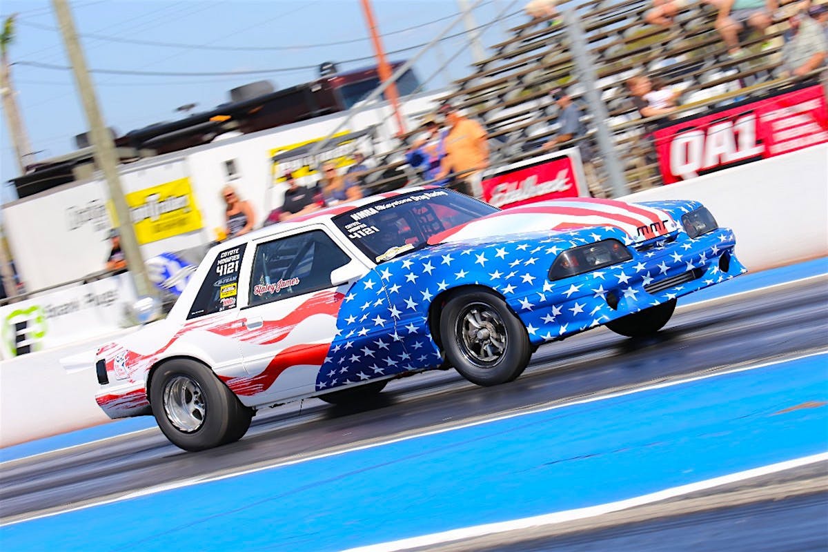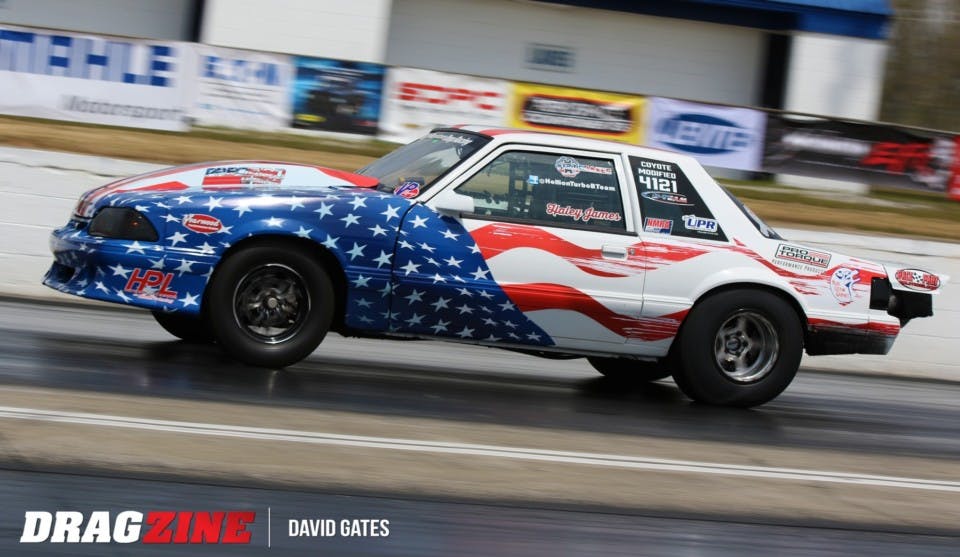 In 2018 James was a buzzsaw in the Coyote Modified class, chopping her way to three event wins and a runner-up finish at the NMRA All-Ford World Finals, on her way to an NMRA championship in the class. Her dominant performance this season was highlighted by a string of runs in the 7.50-second range that were produced by her Precision Turbo & Engine-boosted Mustang.