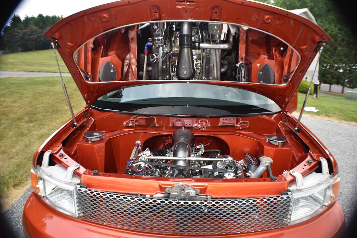 The body of the Scion xB has been modified to accommodate the V8 Chevy engine, with custom modifications made to the engine compartment. A new floor was crafted to house the new chassis, while the rear wheel wells were mini-tubbed to accommodate the wider tires. The exterior boasts a flawless two-stage “Lava” Scion color, devoid of any cracks, scratches, or rust bubbles.