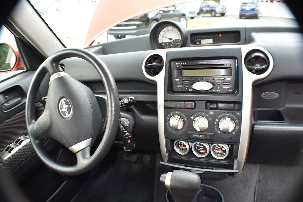 Inside, the stock Scion interior remains largely intact. While the factory gauges are non-functional, an aftermarket GPS speedometer and tachometer have been installed, although they were never connected. Autometer oil pressure, voltmeter, and water temperature gauges function properly. The interior is equipped with a Pioneer multi-speaker AM/FM/CD player, and power windows add convenience.