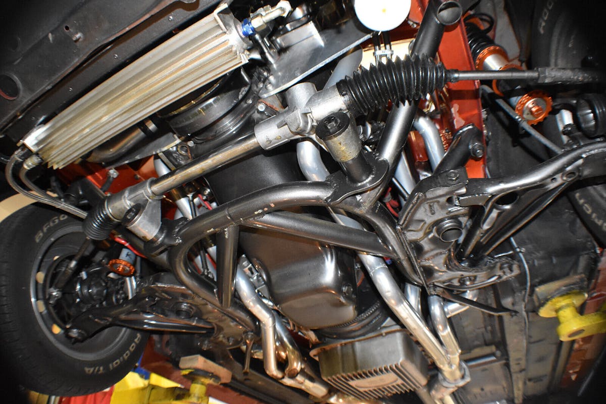 The chassis has been hand-built, incorporating a 4-link rear suspension to support the V8 engine. Non-power rack & pinion steering provides responsive handling, while Koni adjustable coilover shocks in the front and QA1 adjustable shocks in the rear ensure a smooth ride. Custom 15-inch Weld Wheel Drag Lites, fitted with BF Goodrich T/A radials, enhance the vehicle’s grip and style.