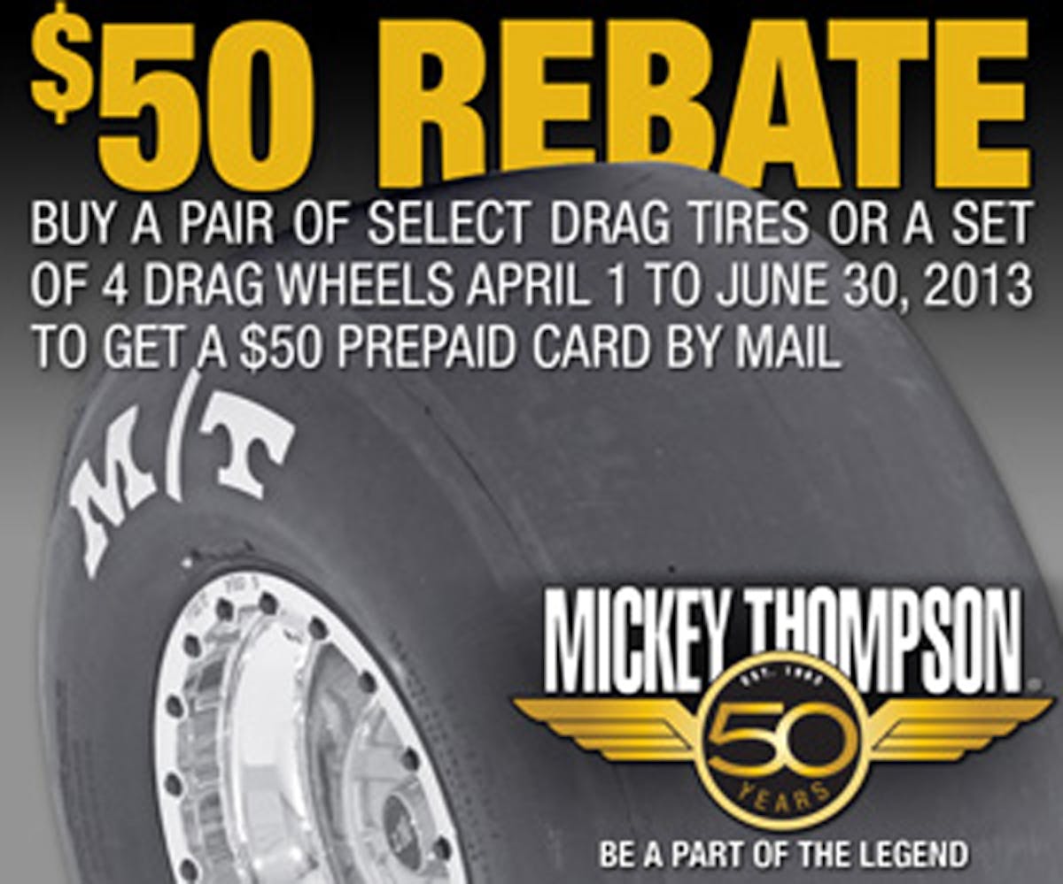 “As part of our 50th anniversary celebration, we wanted to develop a great incentive for our drag tires and wheels,” stated Ken Warner, VP Sales & Marketing, Mickey Thompson. “Choose from the eligible tires and wheels and earn $50 in the form of a prepaid MasterCard as our way of saying thank you for 50 great years.”