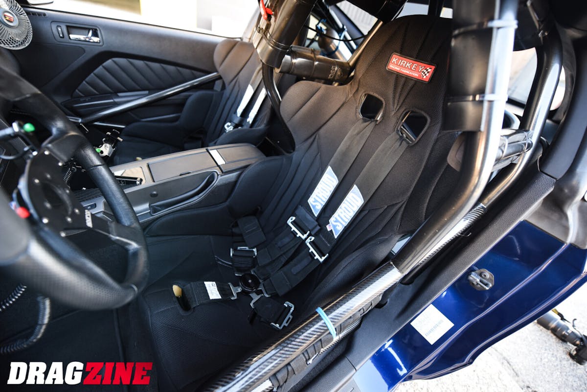 Similarly, Hargett opted to keep as much of his Mustang intact as possible, so the factory steel body panels were all left untouched save for the trunk lid. The factory floor pans are also still in place, and light touches throughout the cockpit such as Kirkey race seats and two Holley dashes, both 12-inch and 7-inch help Hargett keep focused on the job at hand when he’s hustling down the dragstrip.