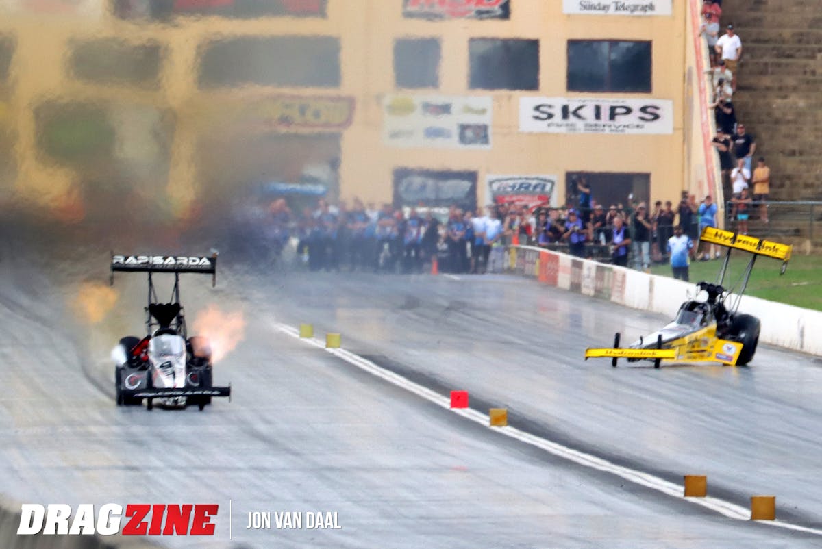 A check-out pass on Friday saw the transplanted Aussie run a respectable 3.99 that was fifth best in the field. The shakedown session times were led by Phil Read, who cranked out a 3.902-second pass in his car’s new yellow Hydraulink Hoses and Fittings livery. RAI driver Damien Harris was next with a 3.854-second, 322 mph pass that was top speed for Friday. The field was rounded out by Peter Xiberass on a 3.854, Wayne Newby on a 3.912, while Phil Lamattina was returning to the seat and did some exploratory laps with a best of 11.84.