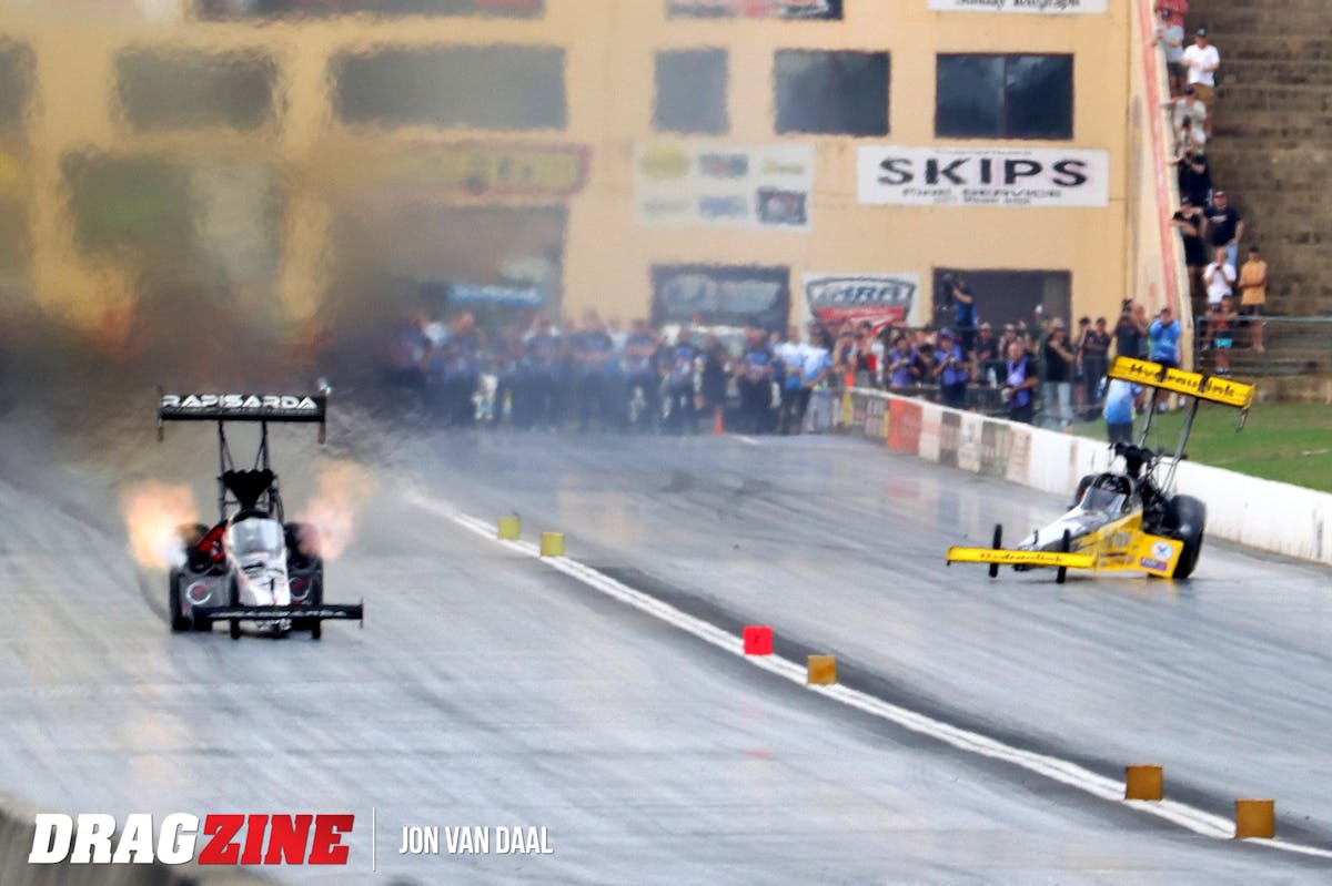 The next pairing put together the PremiAir Hire dragster of Xiberras ,who faced Harris in his RAI digger. On the green Xiberras pulled a .025-second holeshot on his opponent, however, as he went past the tree a fuel fitting was loose and was spraying raw fuel into the air. Still it didn’t affect the pass and his holeshot ensured that a slower 3.872 was too good for Harris’ quicker 3.857.