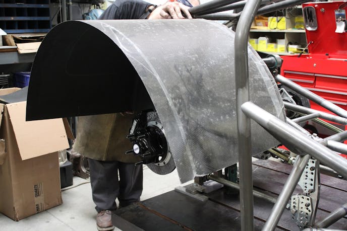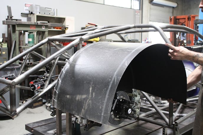Since the Corvette needed a bit more space for the 315 Mickey Thompson radial we are putting under it, a set of carbon wheel tubs from RJ Race Cars had to be added in by PMR.