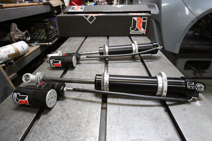 The rear shocks that are providing the dampening support for the rearend of BlownZ06 are a set of drag radial specific shocks from JRi. These shocks are 21.5 inches in length and that helps to provide the critical chassis separation a radial tire car needs to work on the sticky track surface.