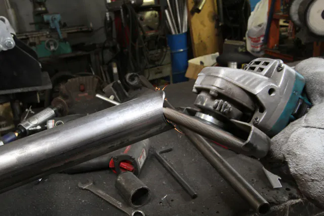 A critical step in building a roll cage is tube notching. You cannot weld a flat-cut tube end to an intersection of another piece of the cage and expect it to be safe. Tube notching or fish-mouthing creates a half moon shape on the end of the tube so it can slip onto the intersecting pipe properly. Usually a specifically designed tube notcher or drill press that allows for variable angles are used with a hole saw on the end. If the cost is too much, a hand grinder can also work, though it can be less accurate.