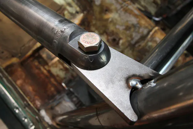 As mentioned above, the swing out door bar pins must be within eight inches of the vertical sections of the front and rear main hoop. Typically, the clevis receiver is welded to the roll cage at the shoulder. The lower portion can use a small piece of pipe welded to the bottom of the front main hoop bar and then the clevis is attached at this point. This allows the needed height for the swing out to function properly. What we did was install the door bar higher up on the front main hoop and in the same fashion as the rear hoop – welded directly to the hoop.